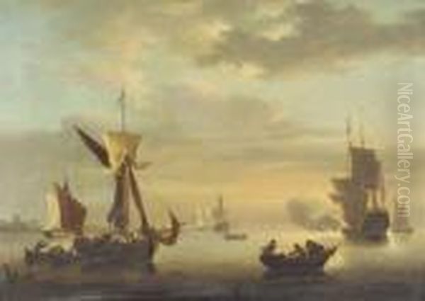 "the Evening Gun", Figures And Fishing Boats In A Dutch Calm With A Warship Firing A Cannon Nearby, Other Shipping Beyond Oil On Canvas, 49.5cm By 70cm *provenance: With W.s. Wilson, Picture Frame Makers, Tower Chambers, 74 Moorgate, London Ec2 Al