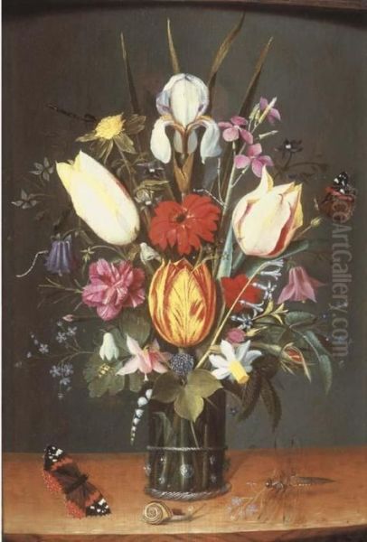 An Iris, Tulips, Forget-me-not, Lilies Of The Valley And Other Flowers In A Roemer On A Wooden Ledge, With A Snail, A Dragonfly And Two Butterflies