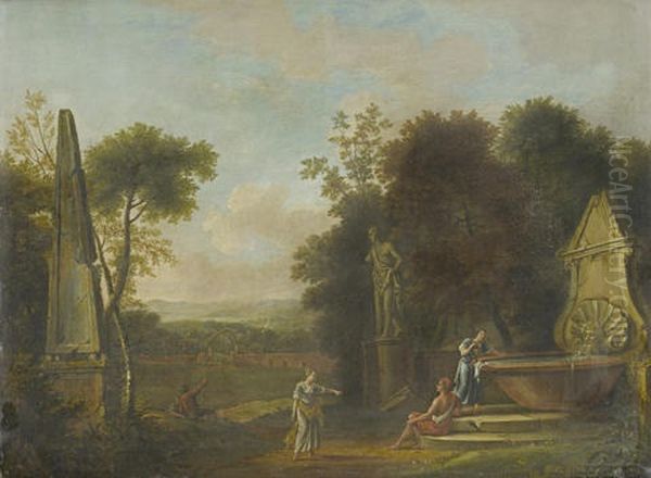 Figures At A Well, Amongst Classical Ruins, In An Italianate Landscape, With A Village In The Distance