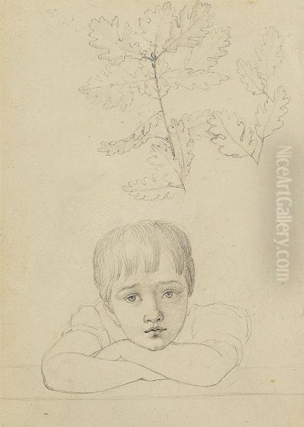 Skizze Eines Nachdenklichen Knaben Und Von Eichenlaubzweigen