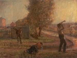 Drenge, der sopper i Ladegardsaen (?). I baggrunden husgavle