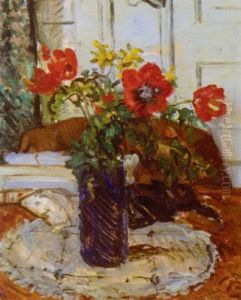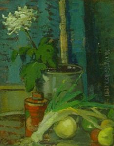Opstilling Med Blomster, Kander Og Frugter Pa Et Bord