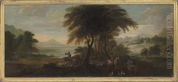 A Wooded Landscape With Huntsmen And Hounds