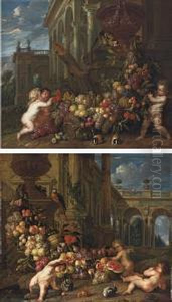 An Architectural Capriccio With Putti Around A Swag Of Fruit