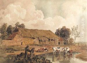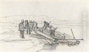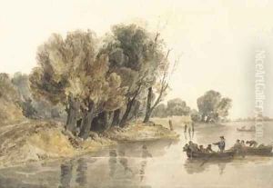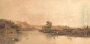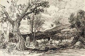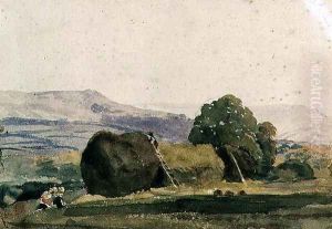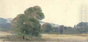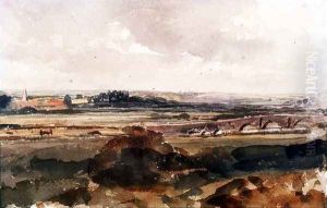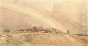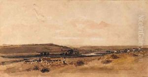 An extensive landscape with figures on a track and buildings beyond, Wales