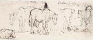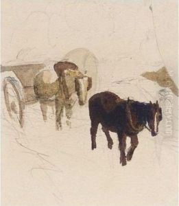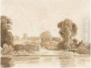 A River Scene; A Horse And Cart Passing A Field With Cows