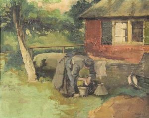A Woman Drying Clothes Outside A Farmhouse Near Methley, Yorkshire