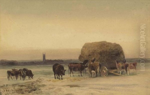 Cattle By A Haycart, A Church Beyond, In The Lincolnshirewolds