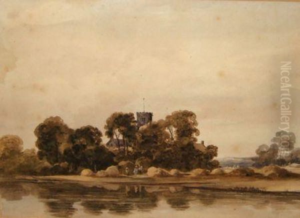 Figures In Harvest Fieldby River And Church