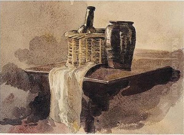 Still-life With A Basket, Wine Bottle, Vase And Cloth