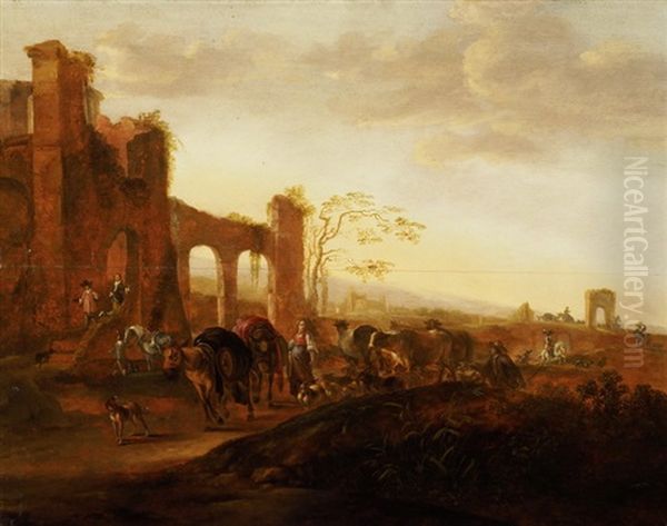 Abendliche Sudliche Landschaft Mit Ruinen, Hirten Und Herde