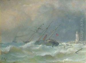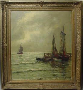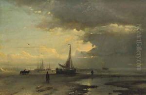 Toegeschreven Aan Vissersschepen Op Het Strand Bij Ondergaande Zon. Ongesigneerd. Verso Sticker Met Signatuur