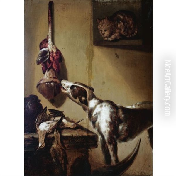 A Kitchen Interior With A Dog Tasting Meat Hanging From The Wall, Dead Partridges On A Table, A Cat In The Window