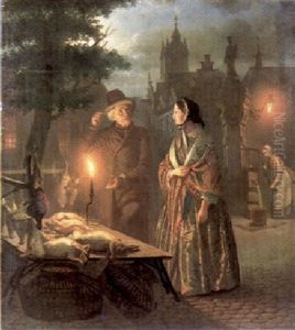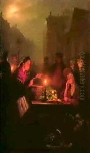 A Market Square At Night With Several Townsfolk By Dead Game And Grocery Stands, Bruxelles