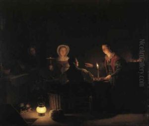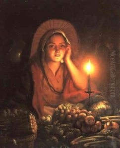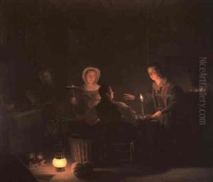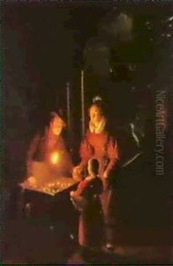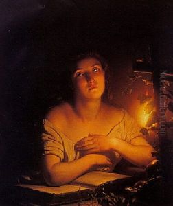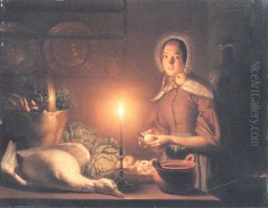 A Candle-lit Interior With A Kitchen Maid Sleeping At A Table