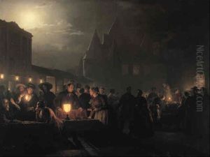 A View Of A Moonlit Square With Several Townsfolk By Marketstalls
