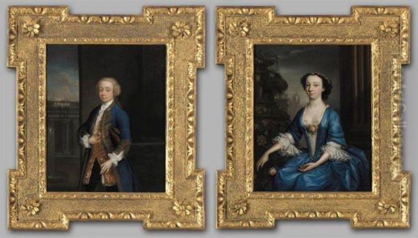 Portrait Of Matthew Lynch Of Drimcong House, County Galway; And His Wife Miss Martyn, Both Three-quarter Length, He Standing, Wearing A Blue Coat With Gilt Frogging And A Yellow Embroidered Waistcoat, She Seated Wearing A Blue Dress