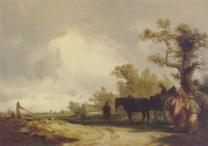 Travellers Conversing At The Side Of A Path, A Horsedrawn Cart Behind With A Cottage In The Distance
