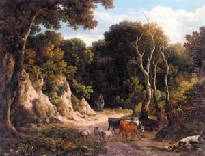 A Wooded Landscape With Cattle And Sheep