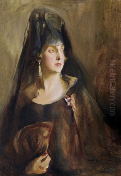 Portrait of Queen Victoria Eugenia of Spain (1887-1969), half-length, wearing a plain sleeveless black gown, the Order of Queen Maria Luisa on a purple and white ribbon pinned to her dress, holding a fan in her right hand