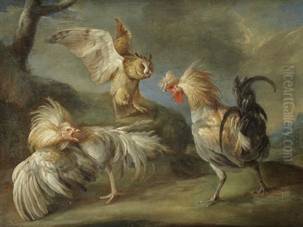 An Owl Attacking Cockerals And Chickens