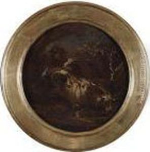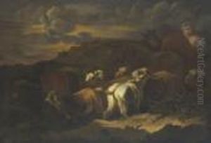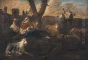 A Shepherd With Cattle And Dogs By Ruins In An Italianatelandscape