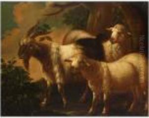 Sheep, A Goat, Rams And A Spaniel Resting By A Stone Wall In Anitalianate Landscape