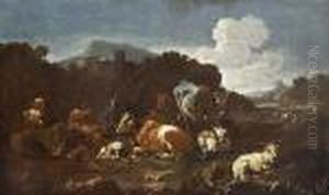 Italianate Landscapes With Drovers, Cattle And Sheep