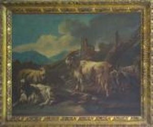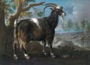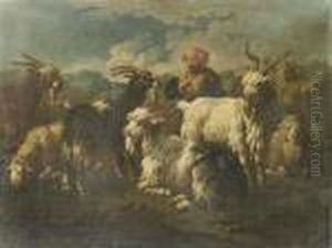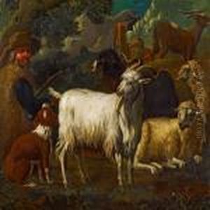 A Peasant With A Goat, Sheep And His Dog In A Landscape