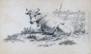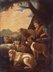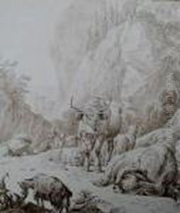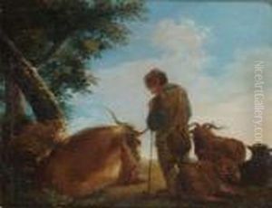 A Shepherd Leaning On A Rock While Lookingafter His Goats, Sheep, Bull And Calf