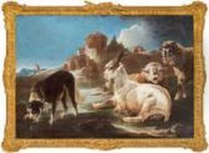 Two Sheep And A Goat, With A Dog Drinking From A Pool Before A Ruin