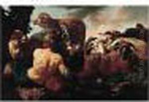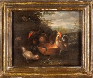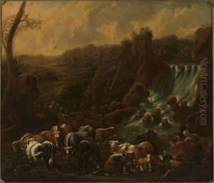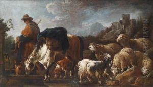 A Drover With A Bull, Sheep, Goats And A Packhorse At A Fountain Ina Mountainous Landscape