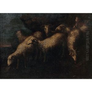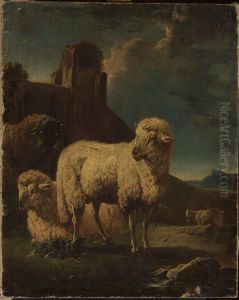 Sheep, A Goat, Rams And A Spaniel Resting By A Stone Wall In Anitalianate Landscape