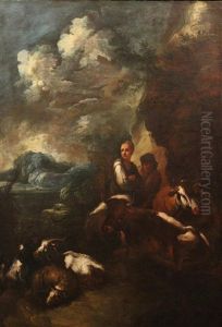 Drovers With A Donkey, Goat And Cattle In An Italianatelandscape