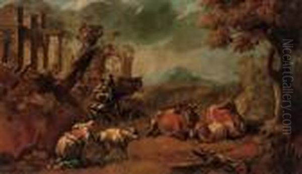 An Italianate Landscape With A Shepherd Playing A Doodlesack And A Shepherdess Milking A Sheep, With Cattle And Classical Ruins Beyond