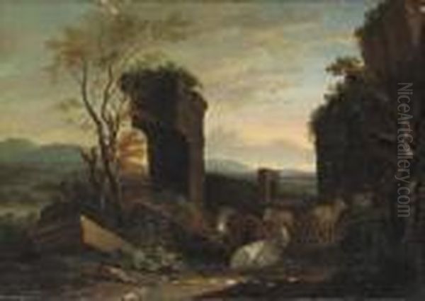 An Italianate Landscape With Cattle Among Ancient Ruins, A River And A Waterfall Beyond