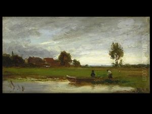 Landschaft In Der Umgebung Von Dusseldorf Mit Zwei Angelnden Kindern An Einem Bachlauf