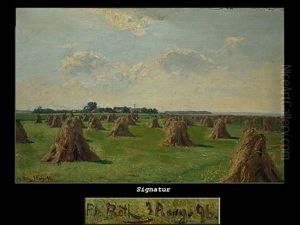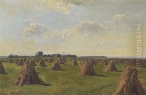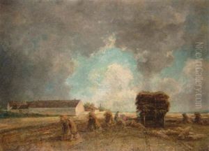 Open Landscape With Harvesters Loading Wheatsheaves Onto A Wagon, Storm Clouds Gathering Above
