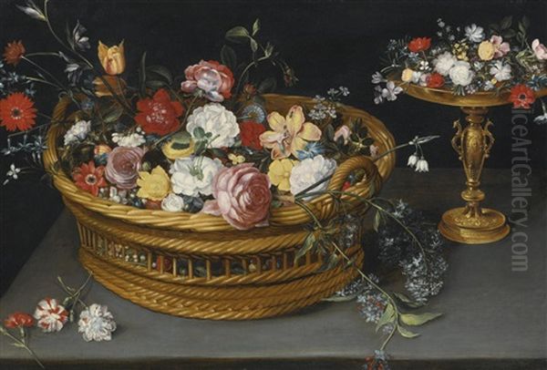 Still Life Of Flowers In A Basket And Flowers On A Gilt Cup, Both Resting On A Ledge