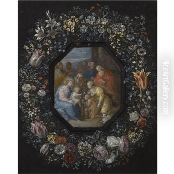 The Madonna And Child With Saint John, Saint Anne And Other Saints Within An Ornamental Cartouche Decorated With A Flower Garland (attributed To Frans Francken The Younger)