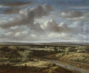 An Extensive Landscape With Figures And Sheep On A Path Through Woodland To The Left, And A Distant View Across A River To A Broad Plain To The Right