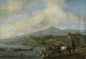 A hawking party with washerwomen and bathers, a ship, a bridge and a town beyond