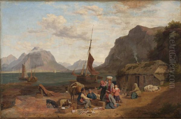Kustlandskap Med Rastande Sallskap Vid Bat