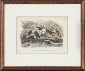 Two Spaniels Upon A Gold Brocaded Cushion One Barking At A Macaw Parrot Perched On A Table Beside Some Melons