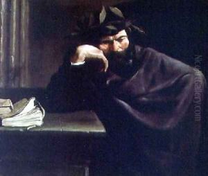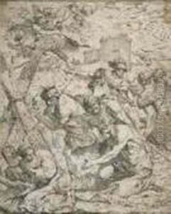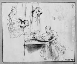 A caricature of Pier Francesco Mola interrupting Giovanni Battista Passeri painting a ceiling decoration of a reclining Venus