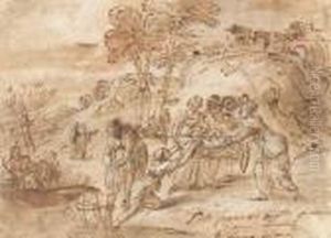 A Caricature Of Pier Francesco Mola Interrupting Giovanni Battistapasseri Painting A Ceiling Decoration Of A Reclining Venus