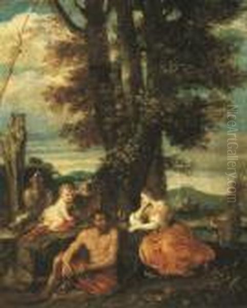 Putto, Satyre Et Bacchante Dans Un Paysage Arcadien