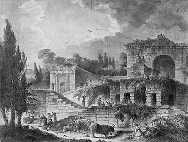 A fountain at the Villa Sacchetti, Rome, with washerwomen and a bull
