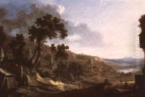 Arcadian Landscape With Figures And Animals Crossing A Bridge Before Classical Ruins