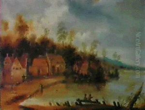 A River Landscape With Figures Resting Beneath A Ruined Temple